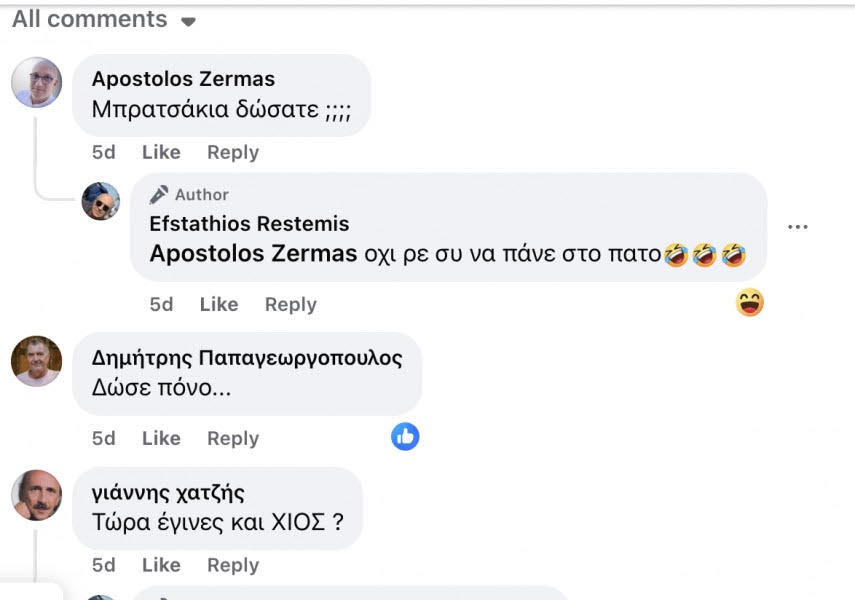 Στο σχόλιο όπου ο μπαρμπα-Στάθης απαντάει να πάνε στον πάτο (!!!) 13χρονα παιδάκια, ο χιουμορίστας που τον ρωτάει αν έδωσε… μπρατσάκια στα ΜΙΚΡΑ ΠΑΙΔΙΑ ονομάζεται, όπως βλέπουμε στην κεντρική φωτογραφία, Απόστολος Ζερμας.