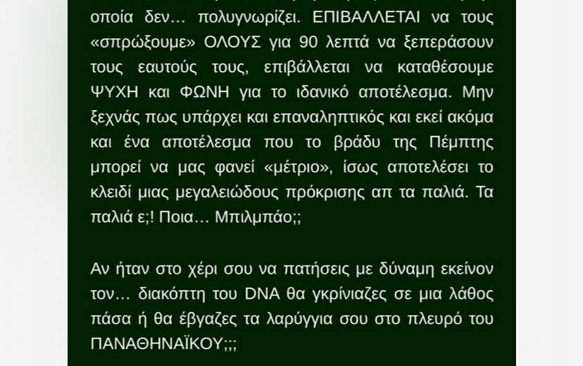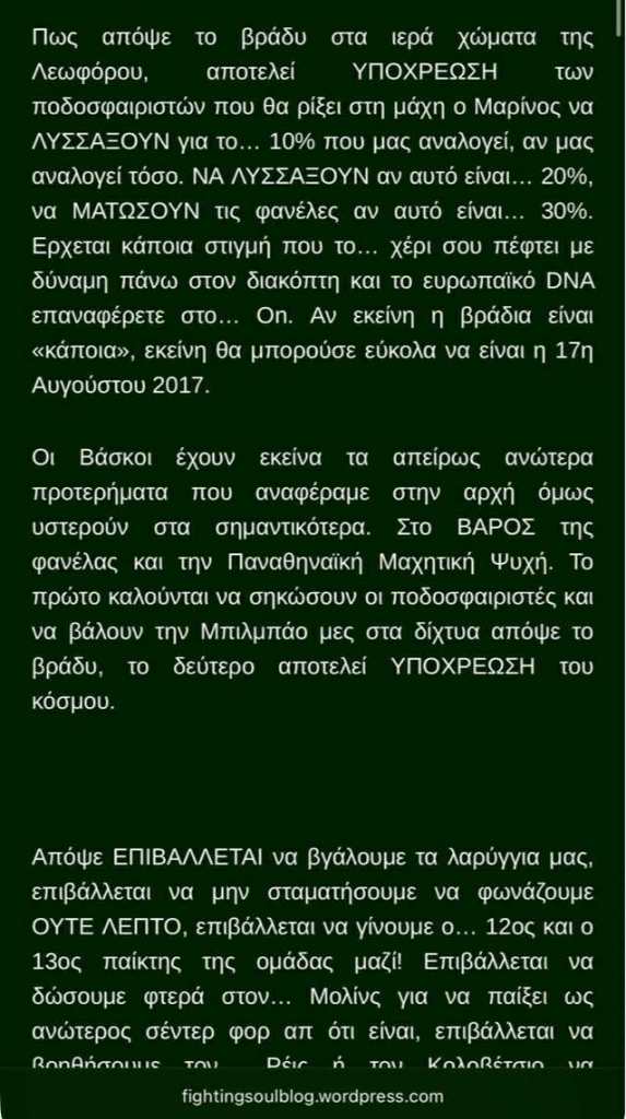 Τα παρακάτω αποσπάσματα είναι από άρθρο στο παλιό Fighting Soul πριν τον μεγάλο προκριματικό της ΛΕΩΦΟΡΟΥ για τα πλέι οφ του Europa League απέναντι στην Αθλέτικο Μπιλμπάο. Είχαμε εισακουστεί κατά το… ήμισυ τότε (βασικά πολύ περισσότερο χρονικά) καθώς πριν ακολουθήσει ένας μίνι «εφιάλτης», ο Παναθηναϊκός είχε ΠΑΤΗΣΕΙ κυριολεκτικά τους Βάσκους προηγούμενος με 2-0 ως το… 70′, σε μια ΛΕΩΦΟΡΟ που ΕΒΡΑΖΕ.
