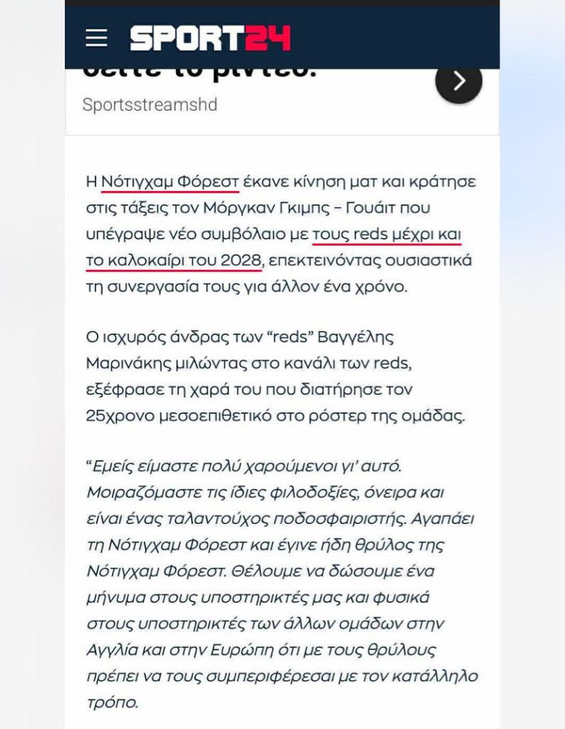 Σαν από καιρό… μυημένοι στο βρετανικό ρεπορτάζ και στα… γραφεία μάλλον της «Sun» όπως βλέπετε παρακάτω, ΓΑΒΡΕΤΤΑ και port24 (θαρρώ και άλλοι) μας ενημέρωσαν… άμεσα πως ο ισχυρός άνδρας της Νότιγχαμ Φόρεστ, πήρε ΠΑΝΩ ΤΟΥ λέει το… θέμα της ανανέωσης του ποδοσφαιριστή Γκιμπς-Γουάιτ τον οποίο αν δεν κάνω λάθος… βολιδοσκόπησε η Τότεναμ. Σαν την… κακομοίρα την… Κρίσταλ Πάλας ένα πράγμα, που… βολιδοσκόπησε το… europa league. Kατέετε που είναι τώρα..