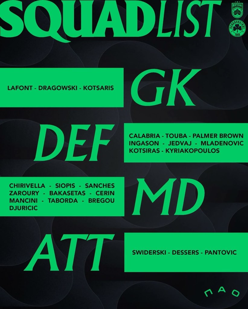 Μετά το τέλος της προπόνησης, ο Ρουί Βιτόρια ανακοίνωσε τη λίστα με τα ονόματα όσων θα ταξιδέψουν στο Βόλο για τον αγώνα. Σε αυτή βρίσκονται οι Ντραγκόφσκι, Λαφόν, Κότσαρης, Καλάμπρια, Τσιριβέγια, Τουμπά, Σιώπης, Σάντσες, Ζαρουρί, Μπακασέτας, Πάλμερ – Μπράουν, Ίνγκασον, Τσέριν, Μαντσίνι, Σφιντέρσκι, Ταμπόρδα, Γεντβάι, Μλαντένοβιτς, Κώτσιρας, Μπρέγκου, Τζούριτσιτς, Ντέσερς, Πάντοβιτς, Κυριακόπουλος.