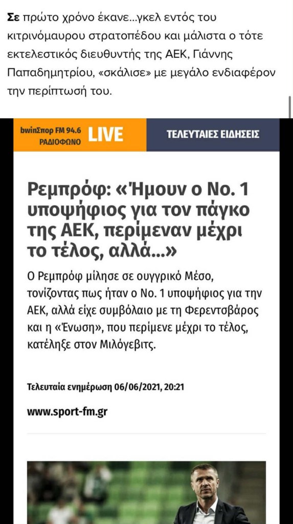 Επειδή μας ρωτάτε… Γράψαμε από χθες, πως από τη στιγμή που ο ΑΝΙΚΑΝΟΣ και στημένος ΤΔ παραμένει εδώ έχοντας ΦΑΕΙ μέσα σε 1,5 ημίχρονο τον Ρουί Βιτόρια, δεν έχουμε ΚΑΜΙΑ αισιοδοξία για κάποιον προπονητή που να κάνει… κλικ. Το «σενάριο» Ρεμπρόφ πχ που βγήκε είναι… ανατριχιαστικό, εκτός αν τον… παίρναμε για σέντερ φορ δίπλα στον Κριστόφ πριν… 20 χρόνια. Ονόματα που… διαρρέονται από έναν ΚΑΘ’ΟΛΑ ΑΝΙΚΑΝΟ τεχνικό διευθυντή που αποτελεί ΣΚΑΝΔΑΛΟ το γεγονός πως συνεχίζει στον Παναθηναϊκό.