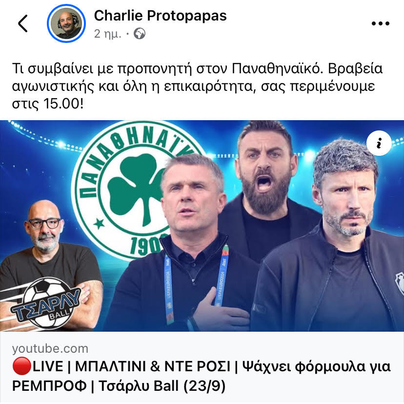 Tσάρλυ, ο… πρώτος. Γιατί ΕΠΕΤΑΙ ΣΥΝΕΧΕΙΑ! Δεν είναι ΚΑΝ δημοσιογράφος, δεν είναι ΤΙΠΟΤΑ βασικά όμως με απίστευτες ΦΑΝΦΑΡΟΛΟΓΙΕΣ επηρεάζει καθημερινώς τους χιλιοταλαιπωρημένους (από τους διοικούντες) οπαδούς του Παναθηναϊκού. Το καλοκαίρι, παίρνοντας κάποιες… μεταγραφικές πληροφορίες από τους ΓΝΩΣΤΟΥΣ που τον έχουν πλευρίσει (ΚΑΙ αυτόν), έγινε για αρκετό κόσμο της ομάδας μας… must (;;;).