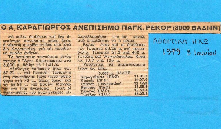 Στα τέλη της δεκαετίας του ΄70 ήταν η σειρά του δρομέα του «τριφυλλιού» Άρη Καραγεώργου να σπάσει το παγκόσμιο ρεκόρ στα 3.000μ. βάδην εντός σταδίου με 11.31.2 στις 7 Ιουνίου 1979 στο Στάδιο «Γ. Καραϊσκάκης», σε ημερίδα του ΣΕΓΑΣ για την προεθνική ομάδα. Πρόκειται για ένα μεγάλο ρεκόρ που επιτεύχθηκε σε ένα ολυμπιακό αγώνισμα αν και η απόσταση του είναι μη ολυμπιακή.
