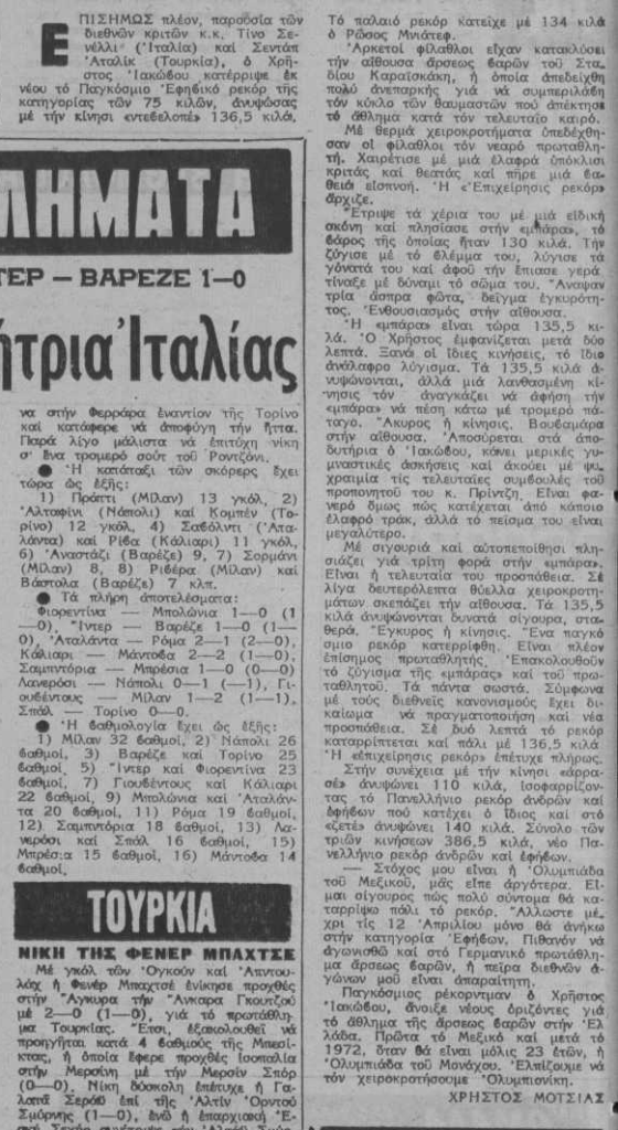 Αργότερα στις 9 Δεκεμβρίου 1967 πήρε τη σκυτάλη ο τεράστιος Χρήστος Ιακώβου στην άρση βαρών που βελτίωσε το παγκόσμιο εφηβικό ρεκόρ της κατηγορίας των 75 κιλών (ήταν 74 κιλά ο ίδιος), στο ντεβελοπέ, με 136.5 κ. στην αίθουσα του Σταδίου «Γ.Καραϊσκάκης» που γινόταν το πανελλήνιο πρωτάθλημα. Το ρεκόρ ως τότε κατείχε ο Ρώστος Νινάτιεφ με 134 κιλά.