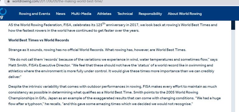 Οι καλύτερες παγκόσμιες επιδόσεις έρχονται κυρίως στο αγώνισμα της κωπηλασίας (που μας αφορά ως Ελλάδα στα ρεκόρ) που ο καιρός παίζει καθοριστικό παράγοντα και για αυτό τον λόγω η επίσημη παγκόσμια ομοσπονδία κωπηλασίας ξεκαθαρίζει ότι δεν υπάρχουν παγκόσμια ρεκόρ όπως στα άλλα αθλήματα λόγω των καιρικών συνθηκών.