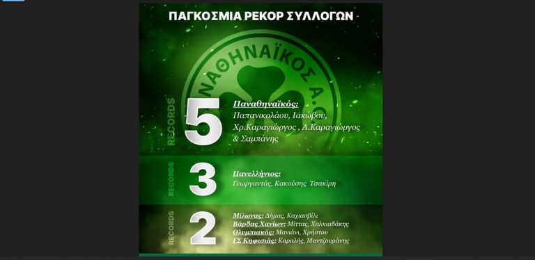 Παραμένει τεράστιο το επίτευγμα του ένδοξου Παναθηναϊκού να βρίσκεται στην κορυφή των ελληνικών ομάδων με τους περισσότερους κατόχους ρεκόρ ανδρών-γυναικών.