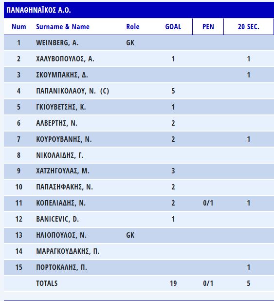 ΠΑΝΑΘΗΝΑΪΚΟΣ Α.Ο. (Δημήτρης Ανδρεόπουλος): Γκάσμαν 7 (3/8 επ., 4 μπλοκ), Γιάντσουκ 14 (9/13 επ., 3 άσσοι, 2 μπλοκ, 64% υπ. – 43% άριστες), Νίλσεν 17 (13/19 επ., 2 άσσοι, 2 μπλοκ), Βουλκίδης 5 (3/5 επ., 1 άσσος, 1 μπλοκ), Ανδρεόπουλος 9 (7/12 επ., 1 άσσος, 1 μπλοκ, 87% υπ. – 53% άριστες), Σπίριτο 3 (2 άσσοι, 1 μπλοκ) / Χανδρινός (λ, 75% υπ. – 58% άριστες), Κασαμπαλής, Πρωτοψάλτης.