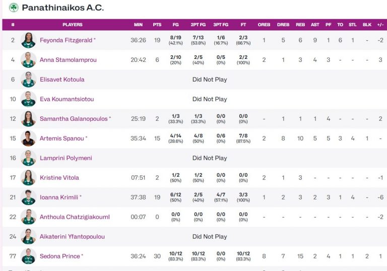 Η Σεντόνα Πρινς έκανε μεγάλο παιχνίδι και πέτυχε 30 πόντους ενώ την ακολούθησαν στους πόντους η Φιτζέραλντ και η Κριμίλη που πέτυχαν από 19 πόντους η κάθε μία.