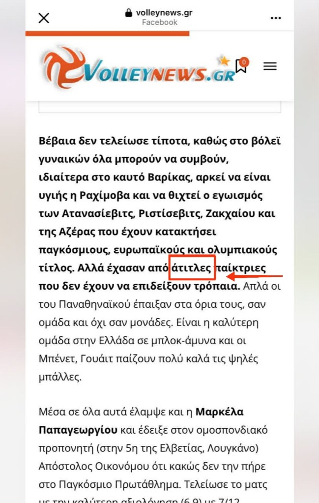 Ιστοσελίδα Volleynews. Δεν θα αναφέρουμε το… όνομα του λιβελλογράφου, αν και γενικότερα δεν έχουμε θέματα σε αυτά, διότι μας ενημέρωσαν πως πέρασε ένα προσωπικό θέμα σχετικά πρόσφατα και εμείς αυτά προσπαθούμε να τα ΣΕΒΟΜΑΣΤΕ. Στην συγκεκριμένη ιστοσελίδα λοιπόν, γνωστών συμφερόντων και… συμπαθειών, πασίγνωστων «μυθευμάτων» επίσης, μετά το τέλος του νικηφόρου πρώτου ευρωπαϊκού αγώνα απέναντι στον Πανιώνιο, ανέβηκε ένα ΑΠΥΘΜΕΝΟ λιβελλογράφημα το οποίο χαρακτήριζε ούτε λίγο, ούτε πολύ τις αθλήτριες του ΠΑΝΑΘΗΝΑΪΚΟΥ… ΑΤΙΤΛΕΣ (!!!!!!)