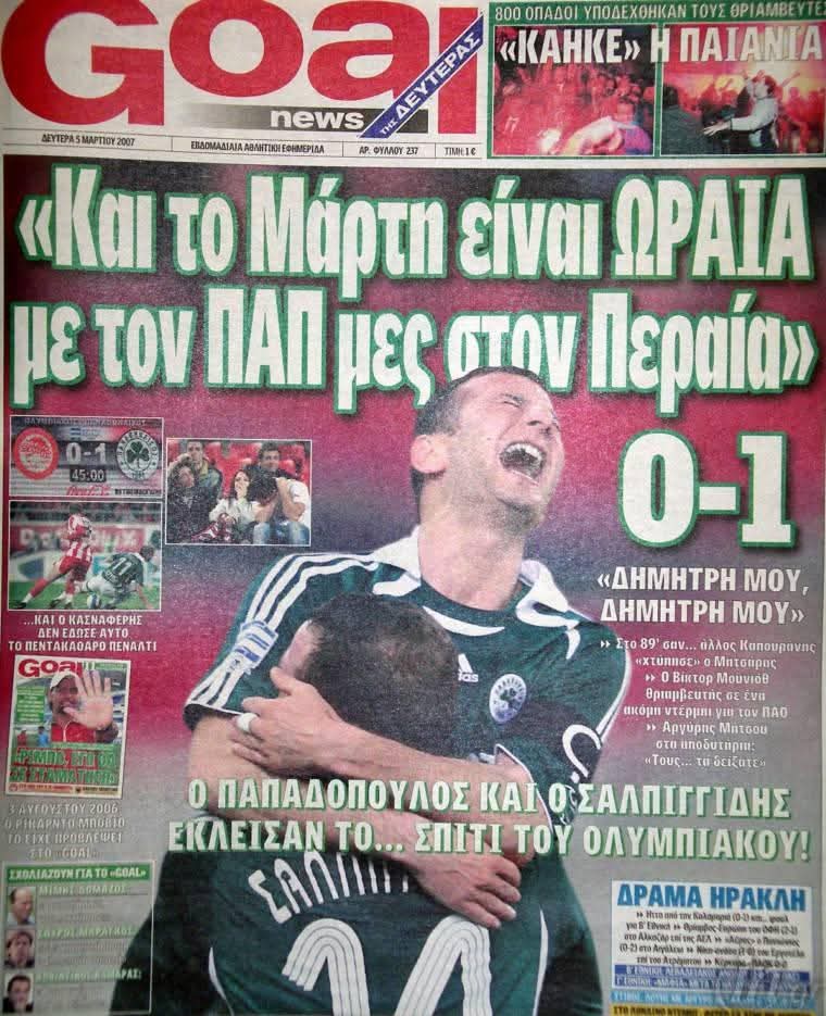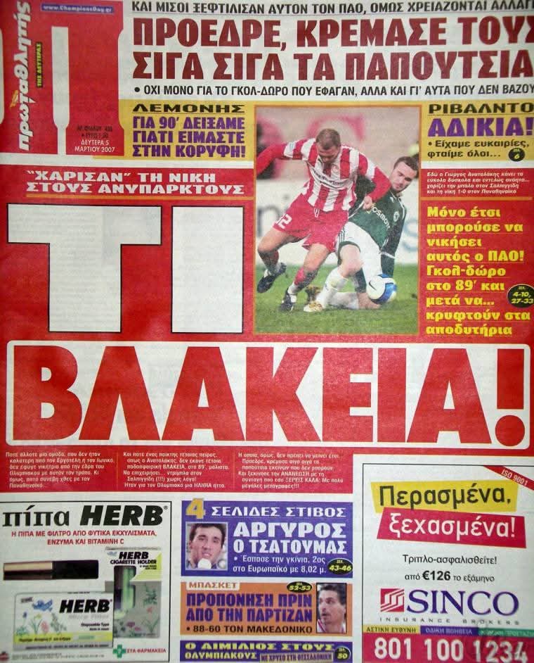 Ένα ακόμα ματς που ΘΑ μας… έβαζαν 4 και 5. Τα έχουμε ΧΙΛΙΟπει. Είναι ο… πολυαθλητικότερος Σύλλογος στο «ΘΑ», στην ΠΡΟΠΑΓΑΝΔΑ, στο «κατασκεύασμα» πρωτιάς. Και όταν έρχομαι εγώ… ΚΛΑΡΙΝΟ. Το συγκεκριμένο κλαρίνο (ένα ακόμα) εκτυλίχθηκε ΣΑΝ ΣΗΜΕΡΑ, στις 4 Μαρτίου 2007 στο γήπεδο του Εθνικού, ήταν ένα από τα πιο ΓΛΥΚΑ γιατί… σφηνώθηκε στο 89ο λεπτό στον πάτο της Αντωνέλας και ήταν ένα ακόμα ντέρμπι στο οποίο βασίλεψε η ζωντανή τους ΜΠΟΧΑ, με την Τριφυλλάρα να βγαίνει αλώβητη και θριαμβεύτρια, συνεχίζοντας την ΠΕΛΑΤΕΙΑΚΗ σχέση.